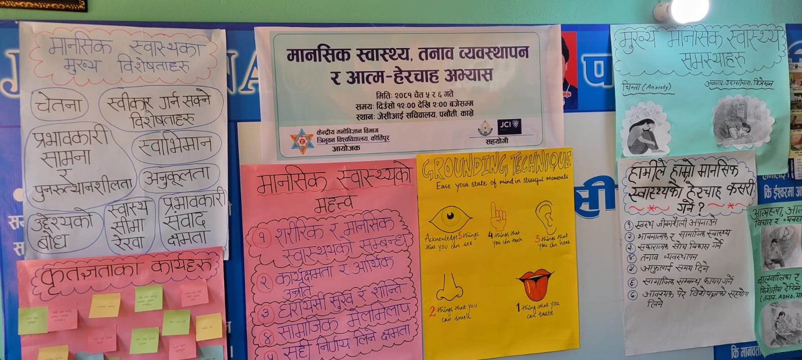 The intervention was carried out by students of the Central Department of Psychology: Deepta Shrestha, Juliyana Shah, Krishna Pant, Krit Kunwar, Nibha KP, Parmeshwor Thapa, and Siddhanta Maharjan. "The program engaged a diverse group of participants, including members of Lions Club Panauti, school teachers, and local community members. It was aimed to promote mental health awareness, reduce stigma, and equip participants with practical strategies for stress management and psychological well-being." Said Juliyana.